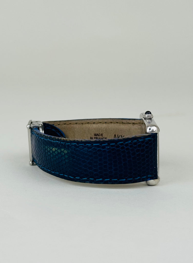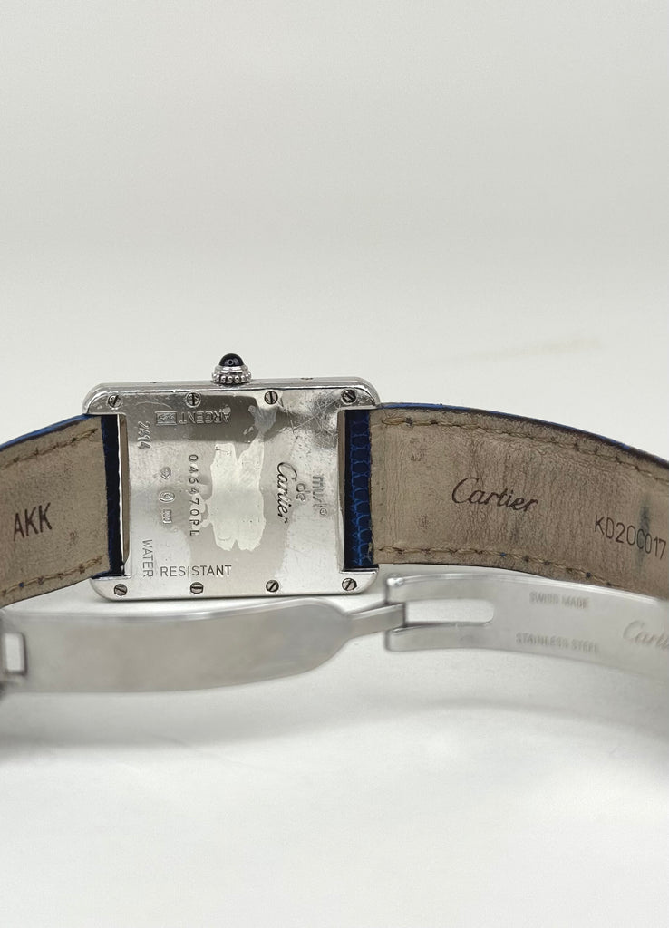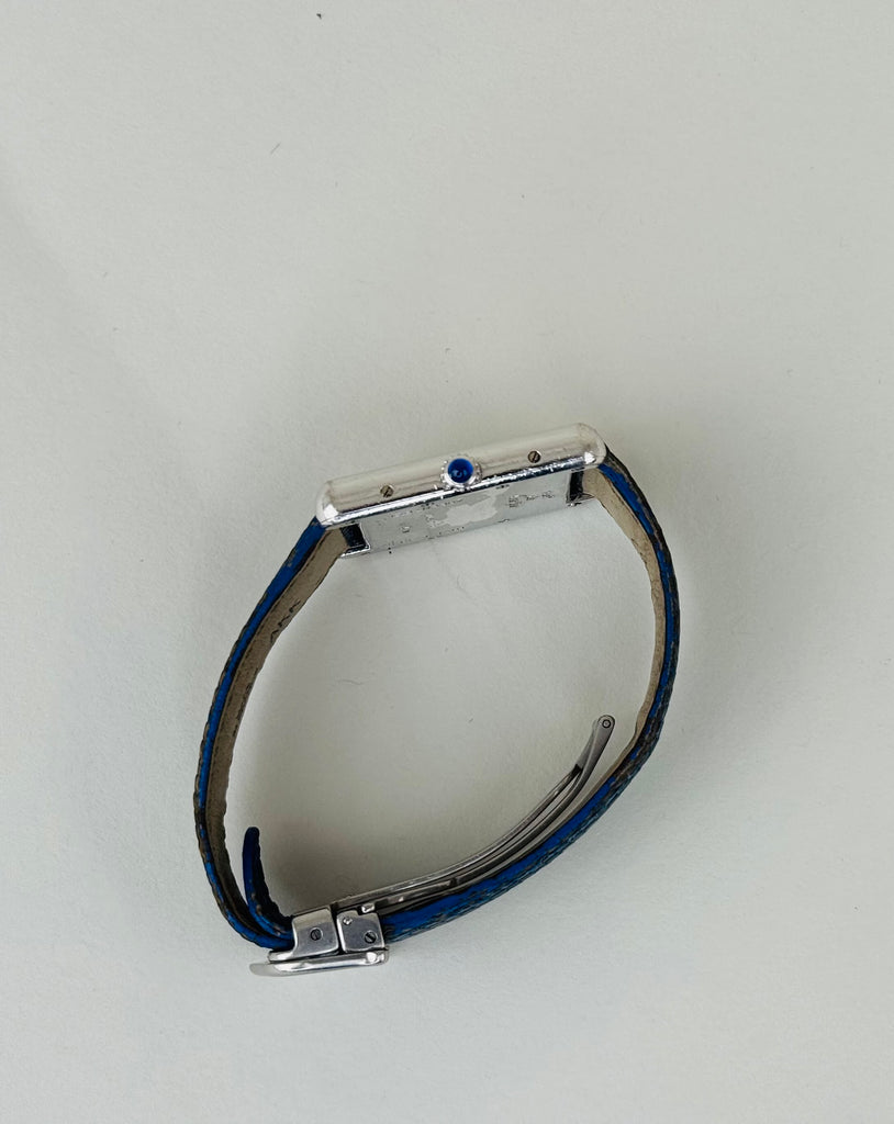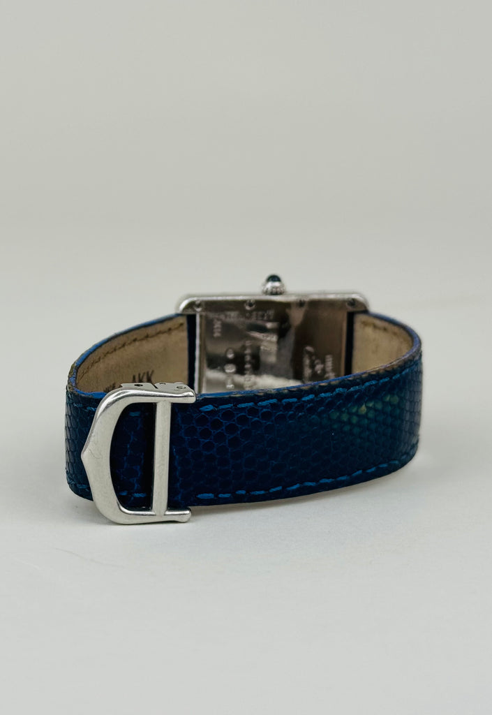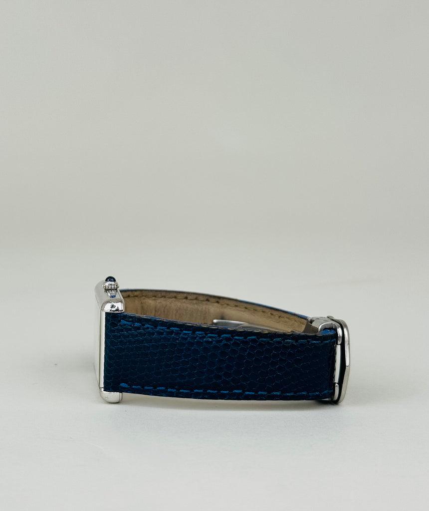 Smuk og stilren Cartier Tank 2414 i silver/stål med karakteristiske blå romertal og blå visere, der giver uret et eksklusivt og moderne udtryk. Modellen kommer med dato-funktion og den ikoniske cabochon-krone, som kendetegner Cartiers tidløse design. Et elegant dress-ur med stærk tilstedeværelse, perfekt til både hverdag og formelle anledninger.