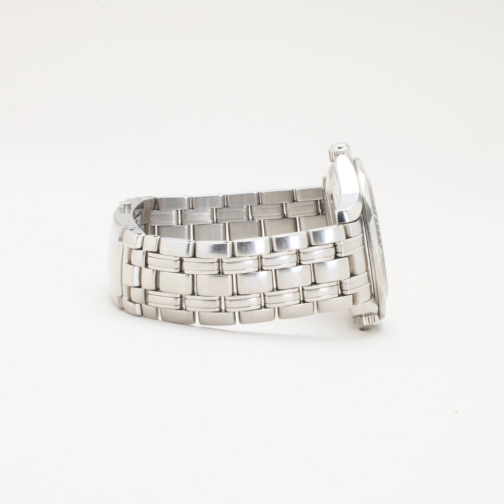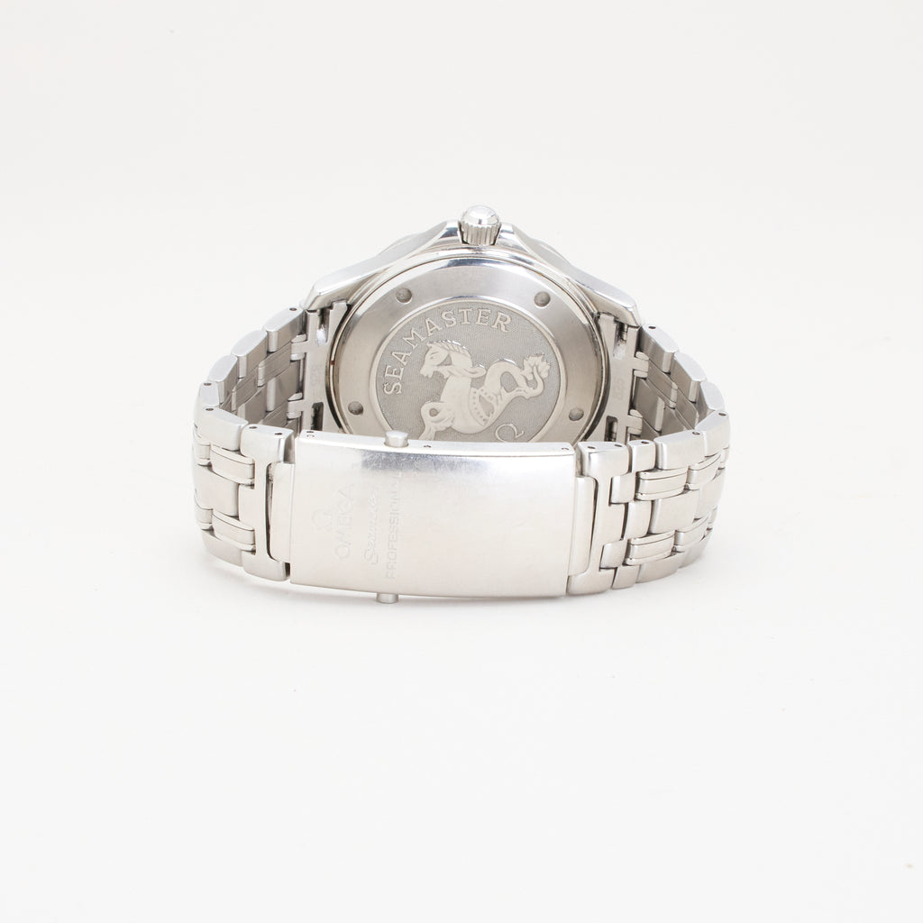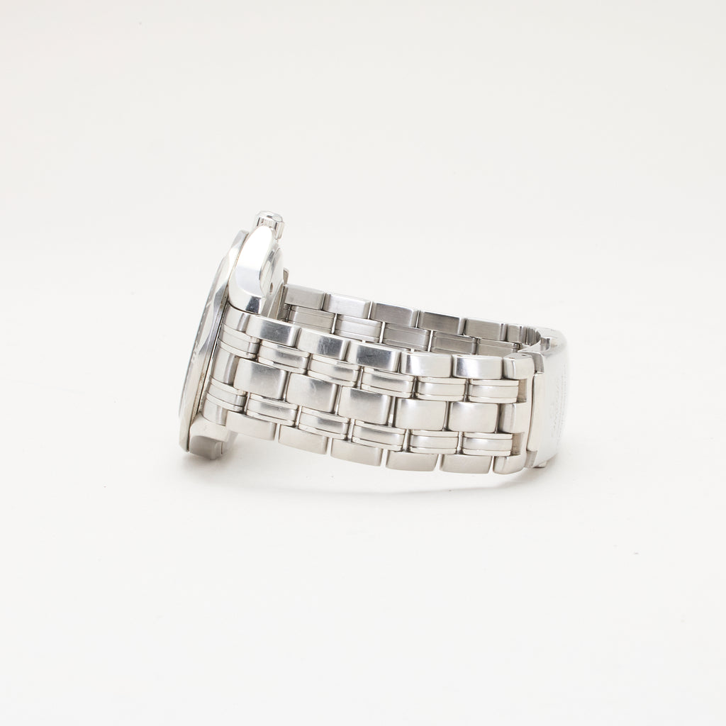 Omega Seamaster Professional 300M er et ikonisk dykkerur, kendt for sit sporty design og kompromisløse kvalitet. Denne model i rustfrit stål har en sort bølgemønstret skive, drejelig dykkerbezel og Helium Escape Valve – klassiske kendetegn fra Seamaster-serien. Drevet af et præcist quartzværk og vandtæt til 300 meter, er det et pålideligt ur til både hverdagsbrug og eventyr under vand.