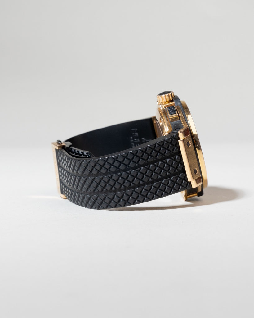 Hublot Big Bang 301.PX.130.RX – 18 kt King Gold En markant og luksuriøs Big Bang-model udført i Hublots eksklusive 18 kt King Gold, som giver en dybere og varmere glød end traditionelt guld. Uret har en sort skive med kronograf, tydelige arabertal og kontrastfulde subdials, der understreger modellens sporty og moderne udtryk. Den klassiske sorte gummirem sikrer høj komfort og fuldender Hublots ikoniske “fusion”-design. Drevet af et automatisk kronografværk kombinerer denne model teknisk ydeevne med kraftfuld æstetik. Et statement piece for den, der ønsker et luksusur med attitude.