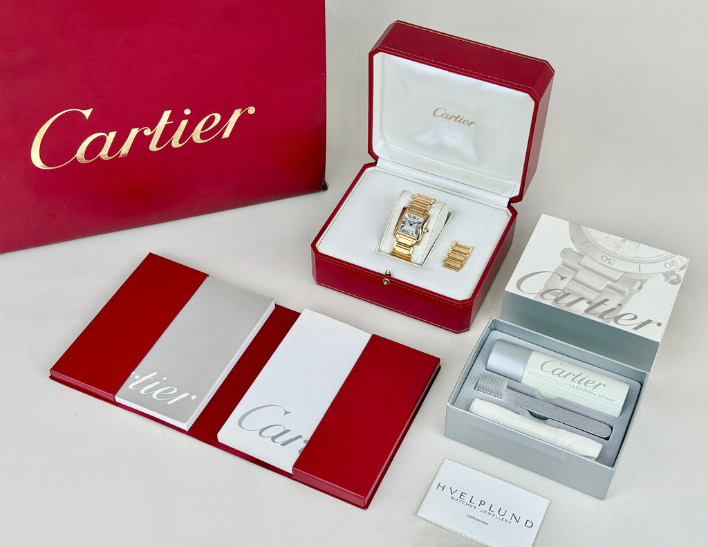 Cartier Tank Française Medium i 18 kt. guld, ref. 2466. En videreudvikling på det klasse Tank, med en mere robust og kraftig urkasse og den genkendelig hvide urskive med sorte romertal og blånede visere. Kronen er monteret med en blå safir, som er et kendetegn på Cartier ure i massiv guld. Den solide guldlænke giver et stilrent og eksklusivt udtryk. Tank Française har siden dets introduktion i 1996, været en af Cartiers mest populære modeller og forener luksus med deres karakteriske design.