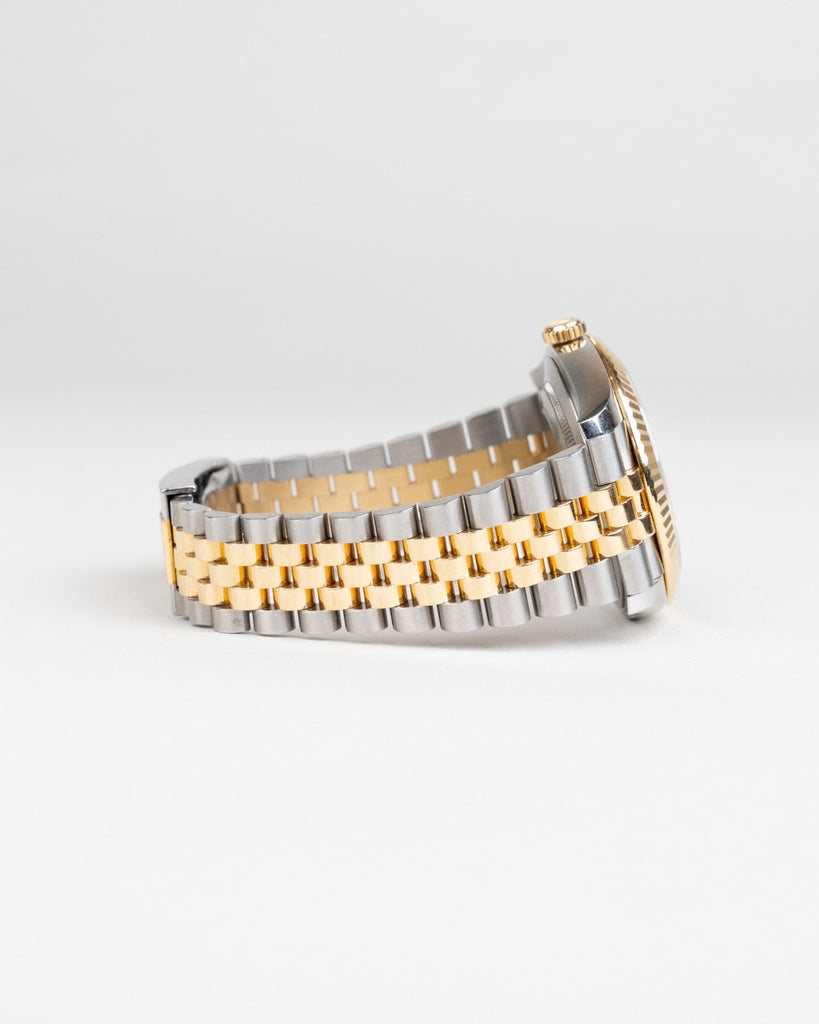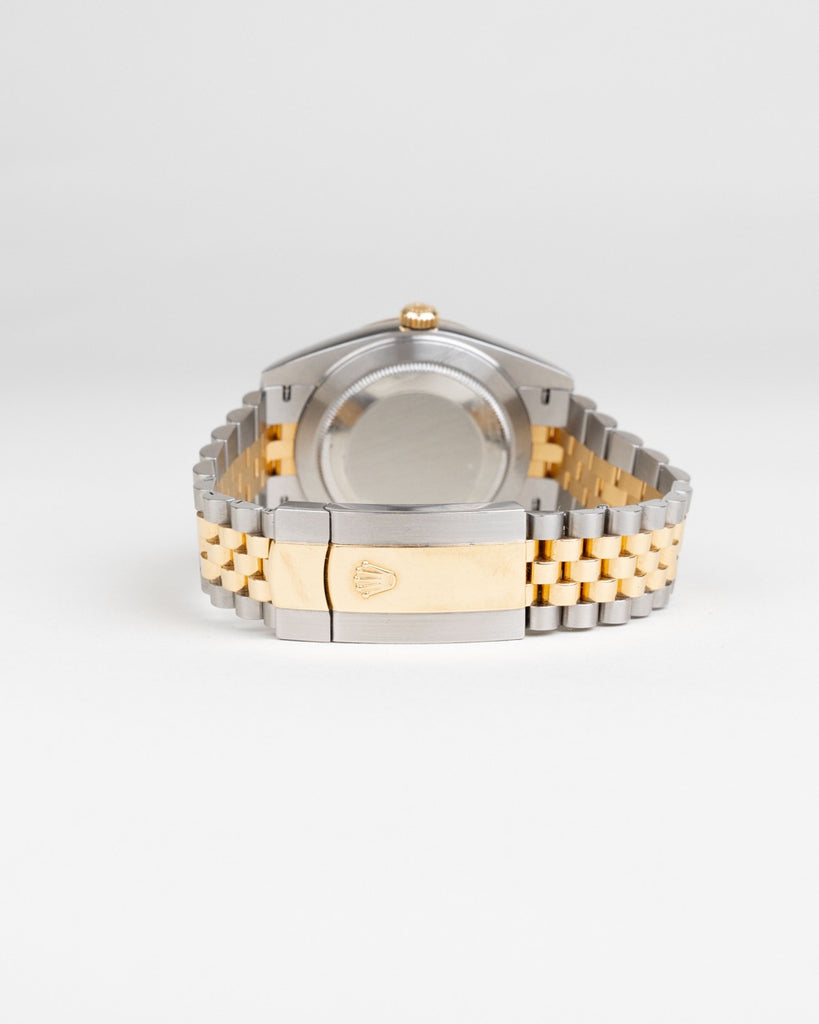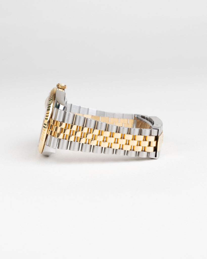 En luksuriøs og moderne Datejust i Rolesor – kombinationen af 904L stål og 18 kt gult guld. Modellen har en eksklusiv champagnefarvet skive udsmykket med funklende diamantindeks, som giver et raffineret og prestigefyldt udtryk. Den riflede guldbezel og den ikoniske Jubilee-lænke fuldender designet. Drevet af det avancerede automatiske Calibre 3235 leverer uret fremragende præcision og pålidelighed. Et tidløst valg for dig, der ønsker en elegant Datejust med ekstra glans.