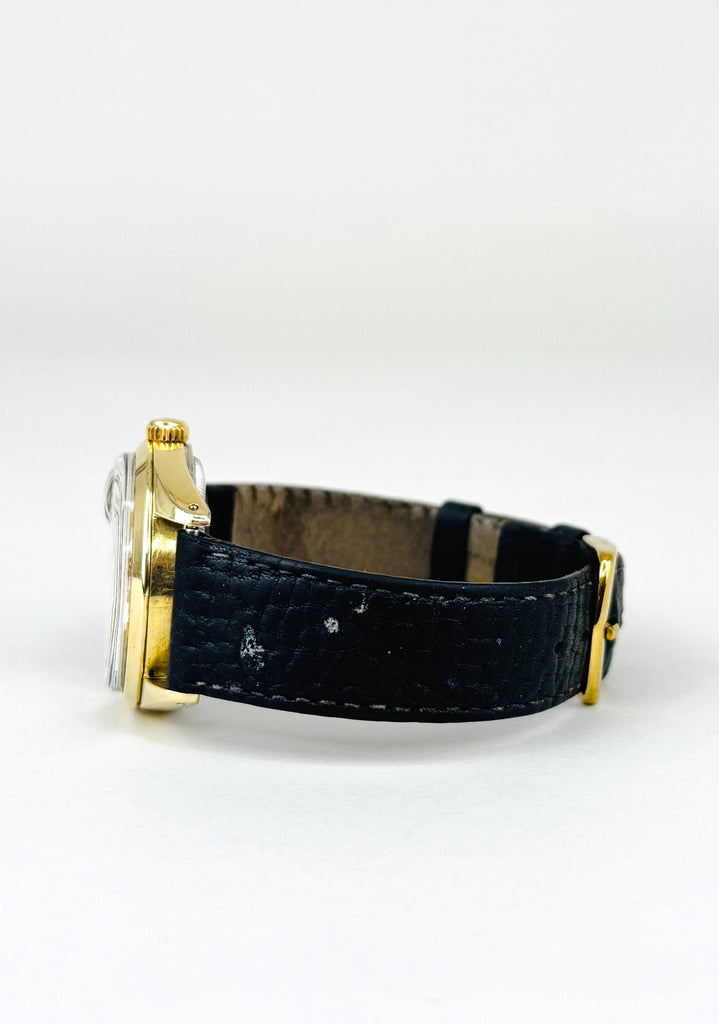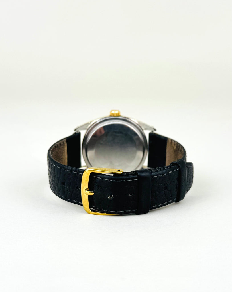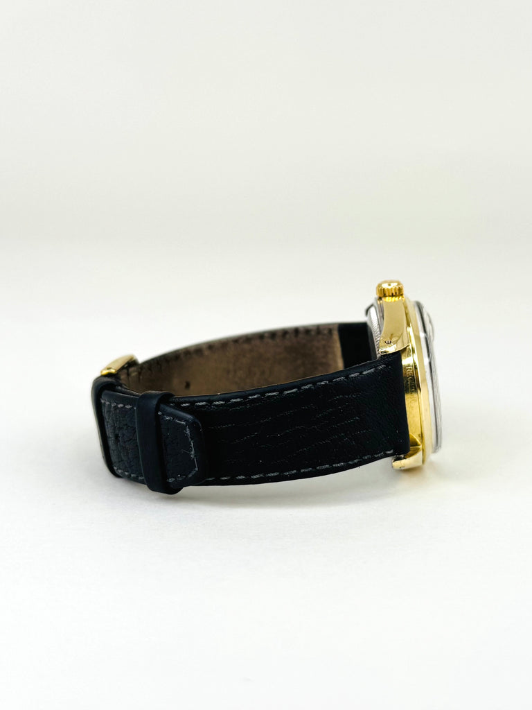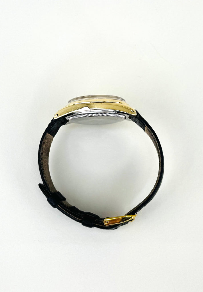 Denne Rolex ref. 1550 er et smukt eksempel på tidløs vintage-stil. Uret kommer i en elegant guldfarvet kasse, kombineret med en karakteristisk sølvpatineret “brushed” skive og gyldne indeksmarkeringer, som giver et varmt og eksklusivt udtryk. Modellen drives af et automatisk kronometer-certificeret værk og har den ikoniske datovisning med cyclops-linse. Et klassisk og raffineret Rolex, perfekt til dig der ønsker vintage-charme med ægte Swiss luxury.
