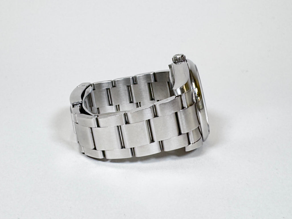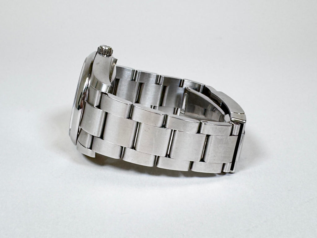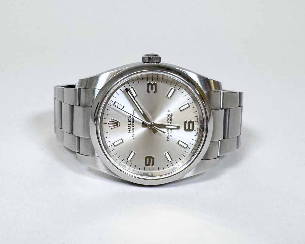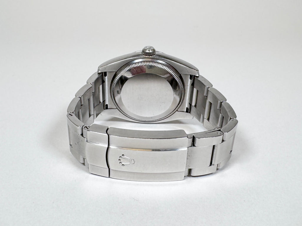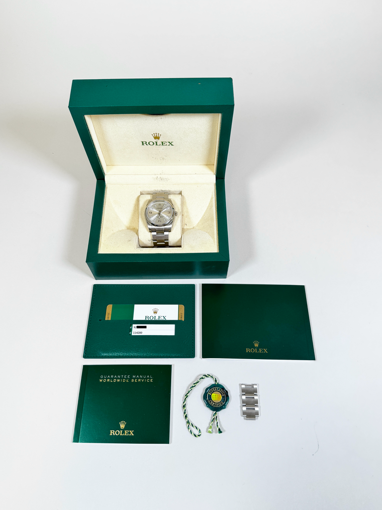 Rolex Air-King 114200 – Klassisk, ren og pålidelig Rolex Air-King 114200 er indbegrebet af enkel, tidløs designæstetik. Med sin 34 mm stålkasse, glatte bezel og klare, letlæselige skive leverer modellen et elegant og diskret udtryk, der passer til alle lejligheder. Uret drives af et automatisk kronometer-certificeret værk og kommer med den robuste Oyster-lænke, som gør Air-King til en pålidelig hverdagsmakker. Et perfekt valg for dig, der ønsker et klassisk Rolex uden overflødige detaljer – kun ren kvalitet.