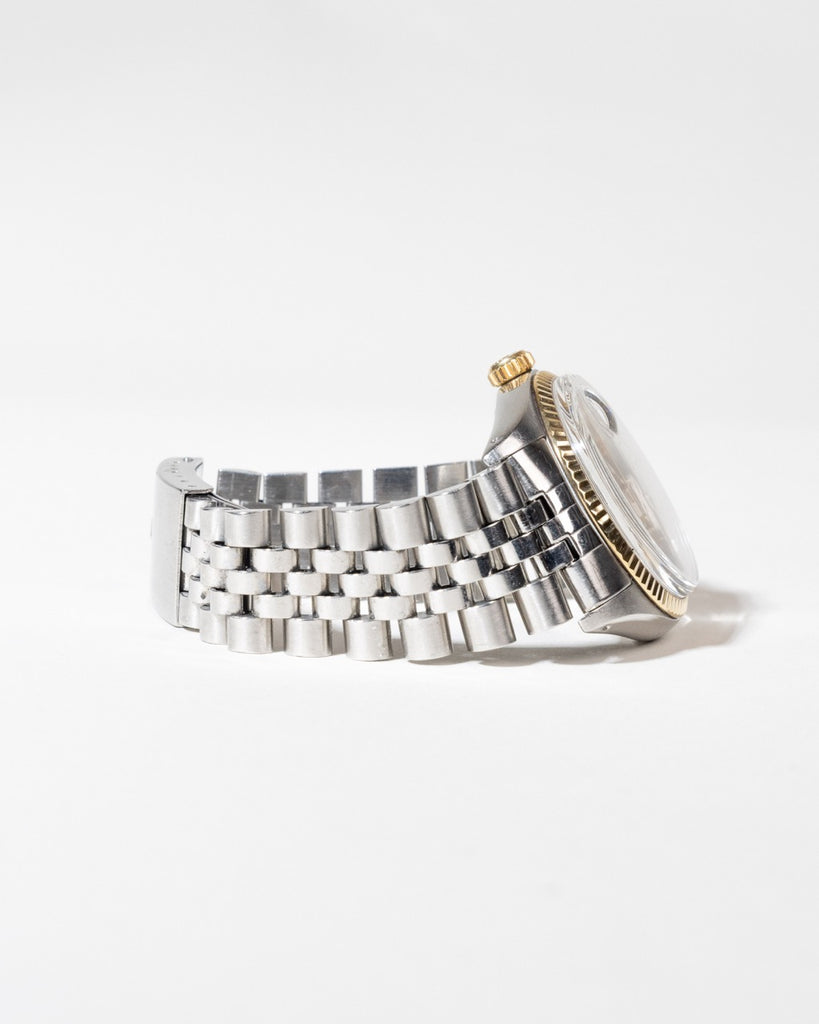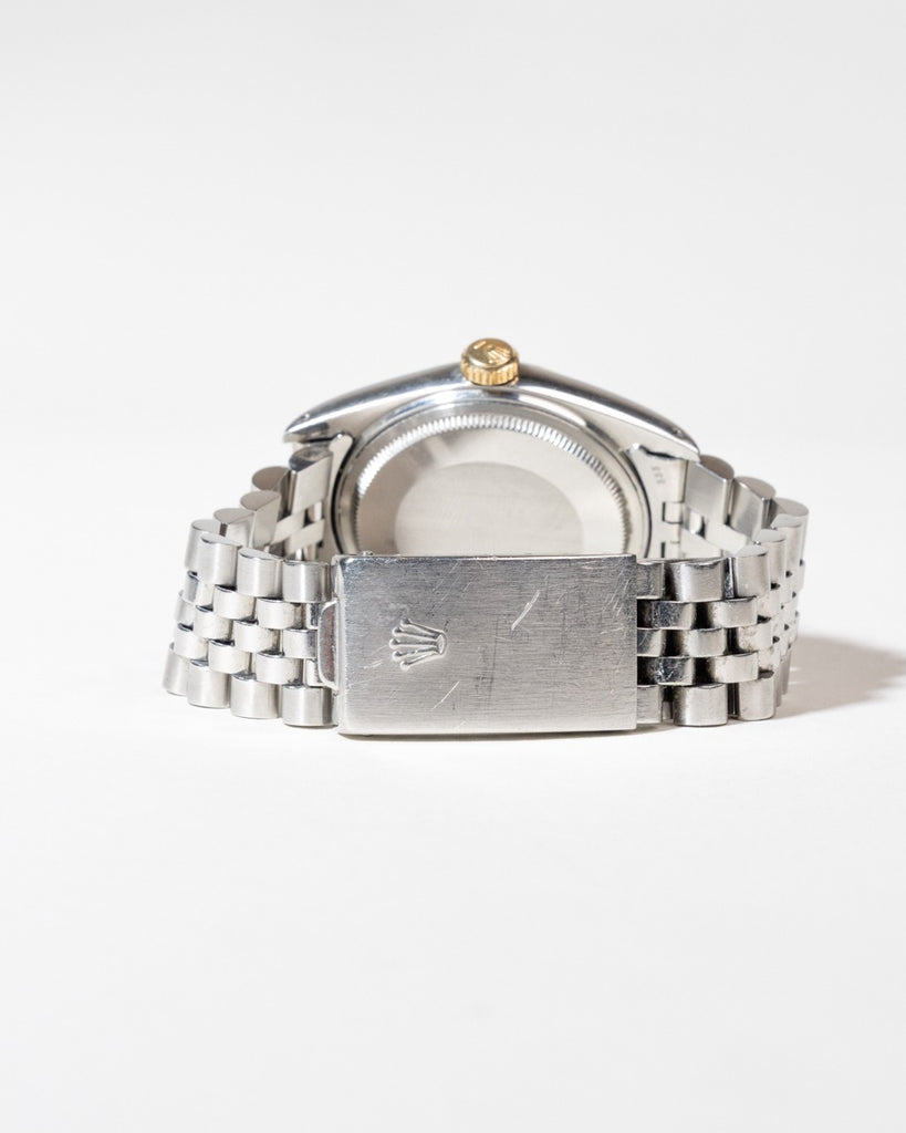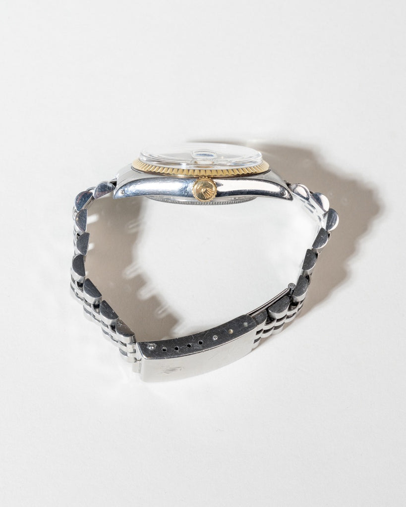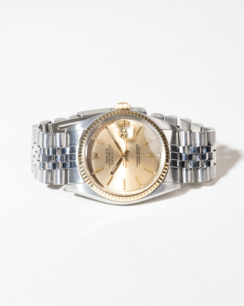 Rolex Datejust 16013 – Stål & Guld En klassisk og eftertragtet Rolex Datejust i Rolesor, kombinationen af stål og 14 kt gult guld. Modellen har en varm champagnefarvet skive med slanke guldtone-markeringer og datovisning under den ikoniske Cyclops-linse. Den riflede guldbezel giver et eksklusivt udtryk, mens Jubilee-lænken fuldender det tidløse design. Uret drives af det pålidelige automatiske Calibre 3035, kendt for sin præcision og holdbarhed. Et perfekt valg for samlere og entusiaster, der ønsker et ægte vintage Rolex med klassisk karakter.