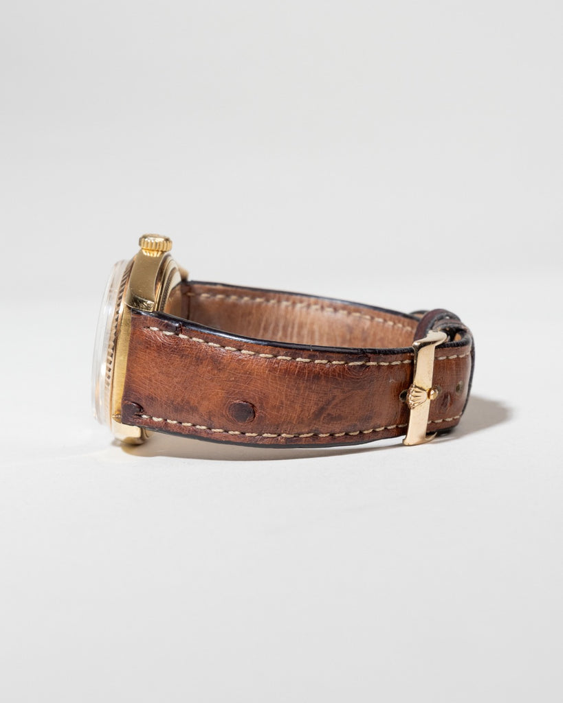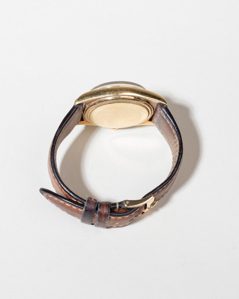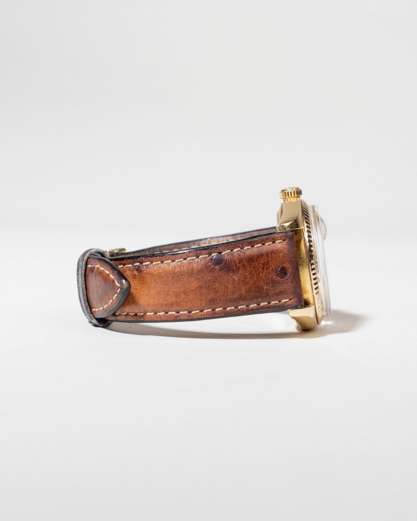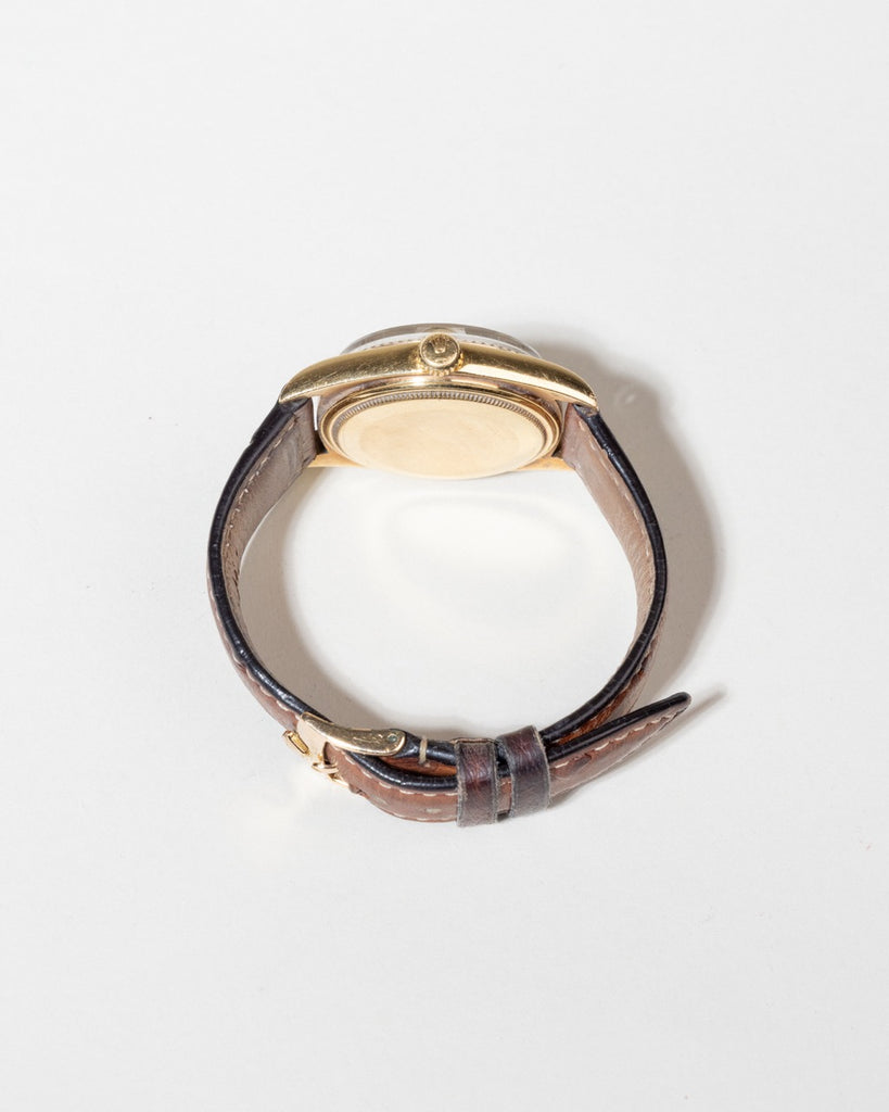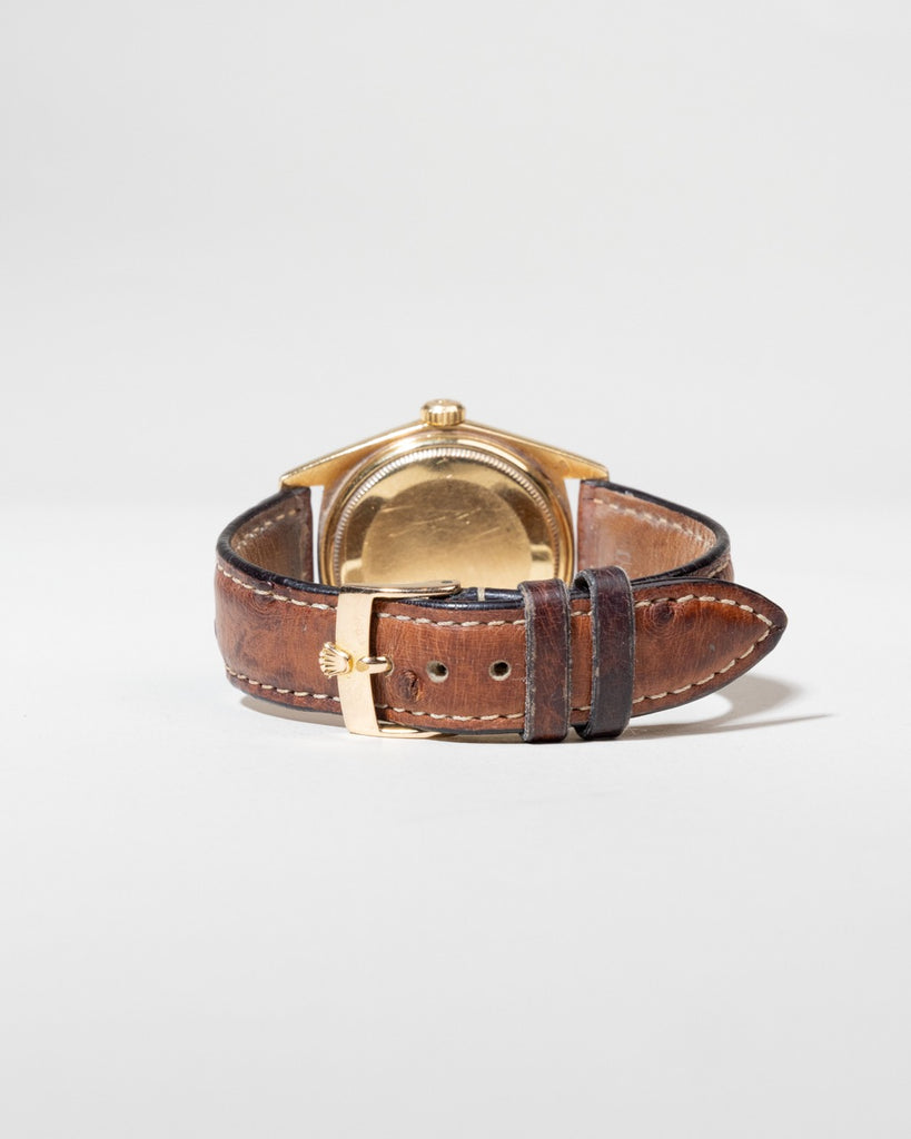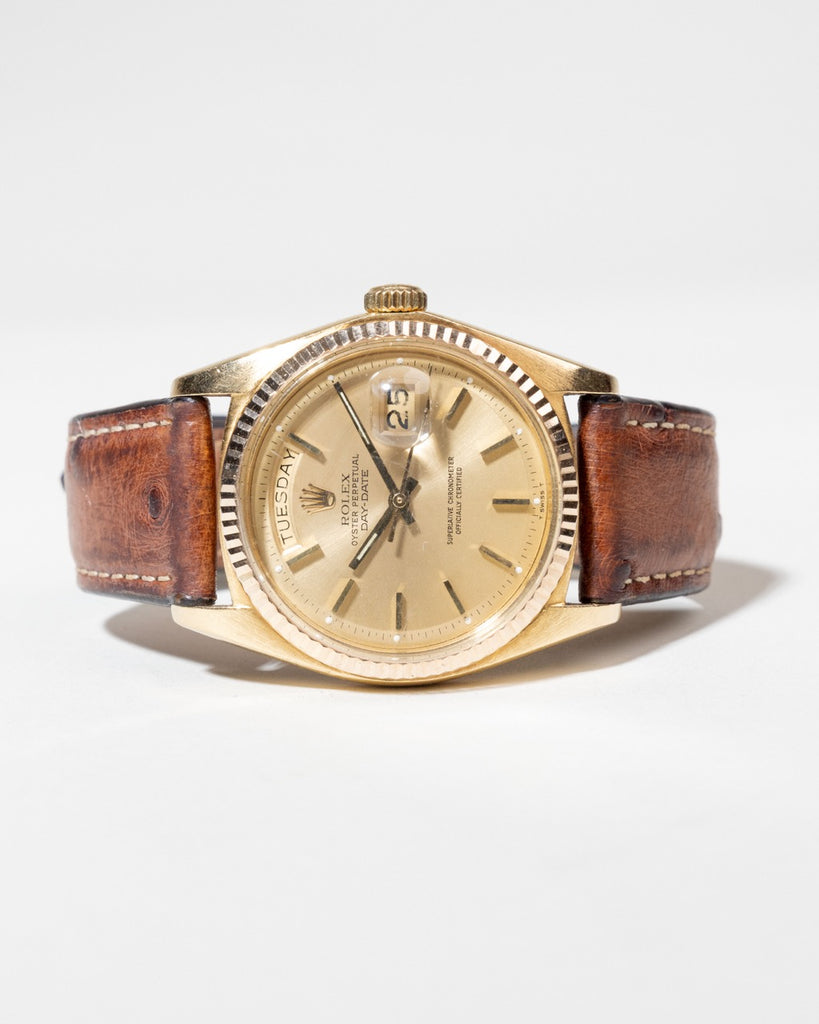 En ikonisk vintage Rolex Day-Date, kendt som “Præsidentens ur”, udført i massivt 18 kt guld. Denne ref. 1803 har en klassisk champagnefarvet skive med dagvisning kl. 12 og dato kl. 3, indrammet af den karakteristiske riflede guldbezel. De slanke guldtone-markeringer og den varme patina giver uret et autentisk og tidløst udtryk. Drevet af et pålideligt automatisk værk kombinerer modellen luksus, historie og klassisk schweizisk håndværk. Et must-have for samlere af vintage Rolex.