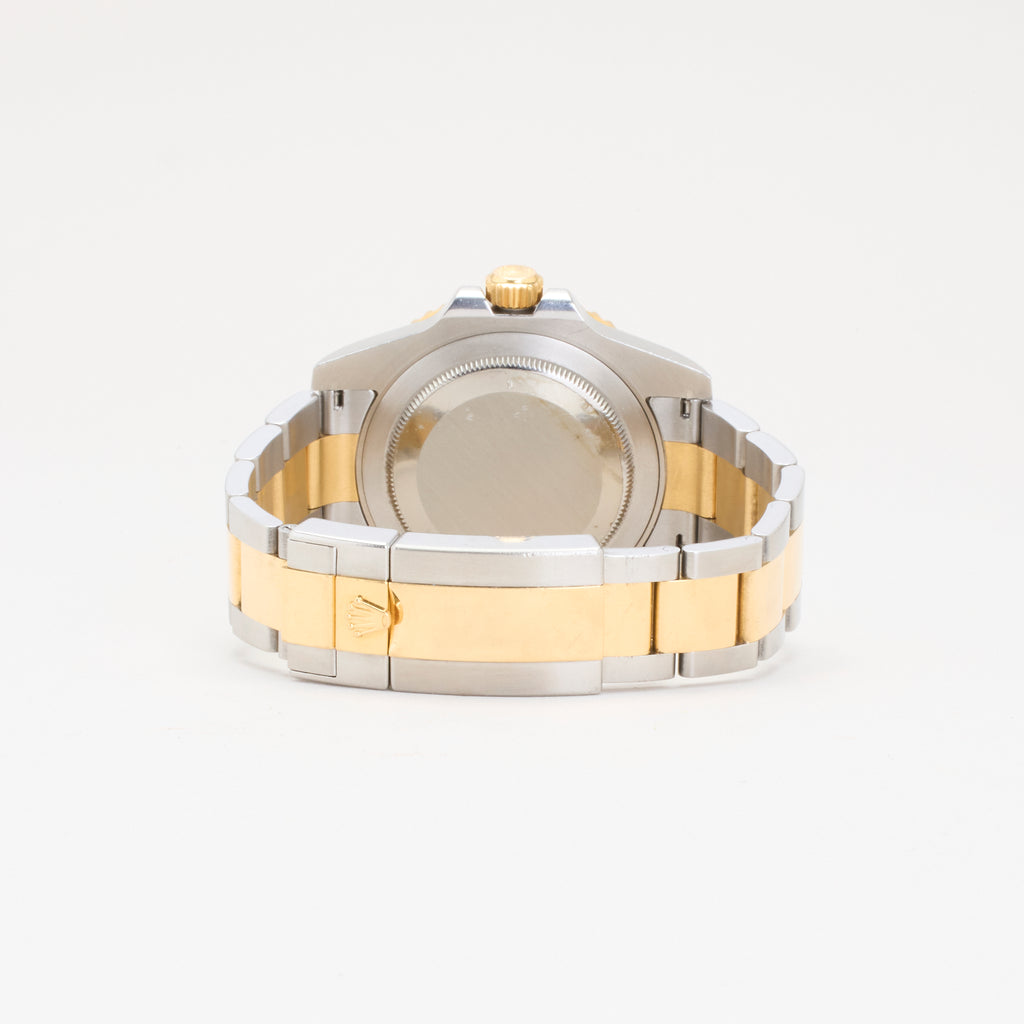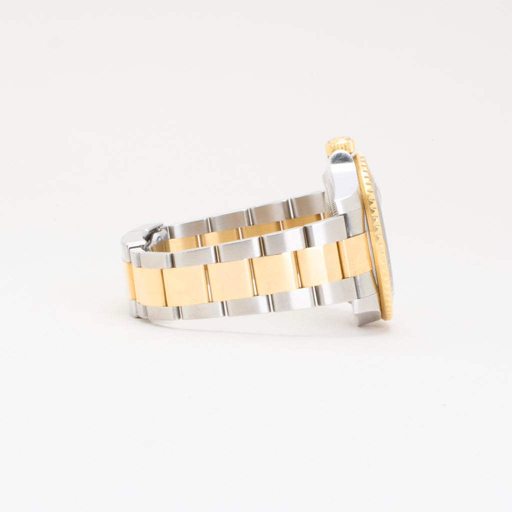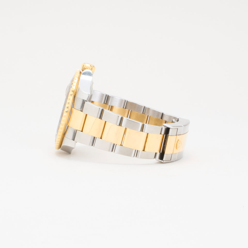 Et ikonisk Rolex GMT-Master II i stål og 18 karat guld – reference 116713LN. Uret kombinerer luksus og funktionalitet med sin sorte keramiske bezel, sorte skive og den klassiske tofarvede Oyster-lænke. Drevet af Rolex’ automatiske caliber 3186 med GMT-funktion, der gør det muligt at holde styr på to tidszoner samtidig. Et elegant og alsidigt ur, perfekt til både forretning og fritid.