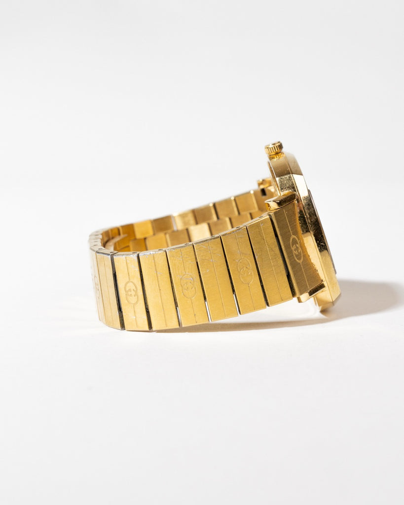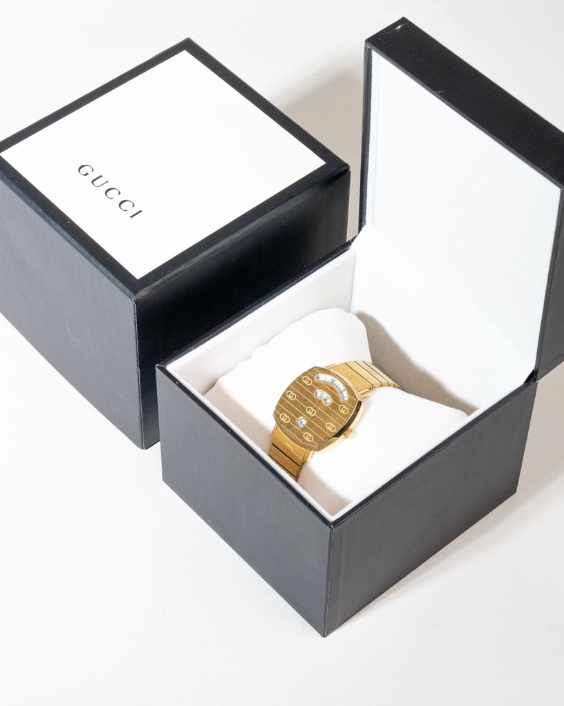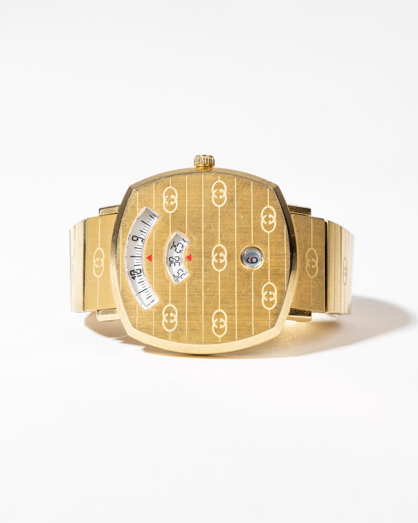 Et moderne og iøjnefaldende unisex-ur fra Gucci, inspireret af 1970’ernes skatekultur. Denne Grip-model har et fuldgyldent tonet design med indgraverede Gucci-logoer over hele fronten, der giver et unikt og grafisk udtryk. Uret viser tid via tre diskrete vinduer, hvor roterende skiver angiver timer, minutter og dato – et innovativt alternativ til traditionelle visere. Den integrerede metalrem fuldender det rene, futuristiske look. Et fashion statement og samlerstykke for dig, der ønsker noget markant anderledes.