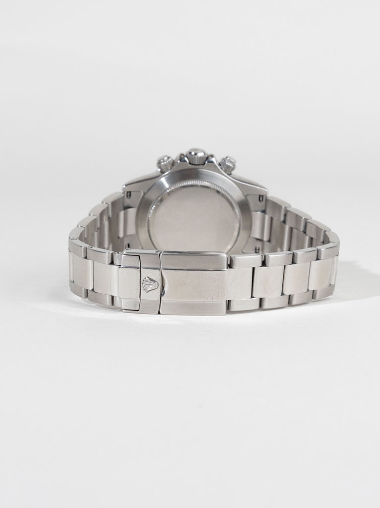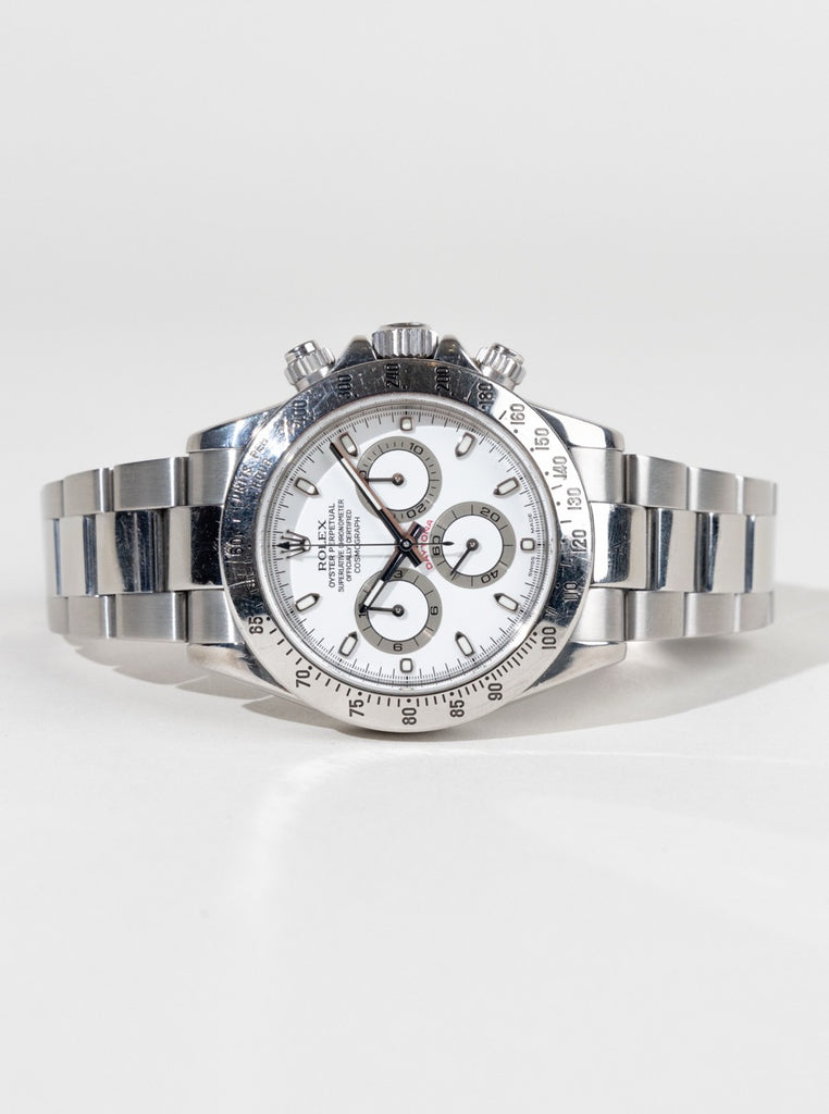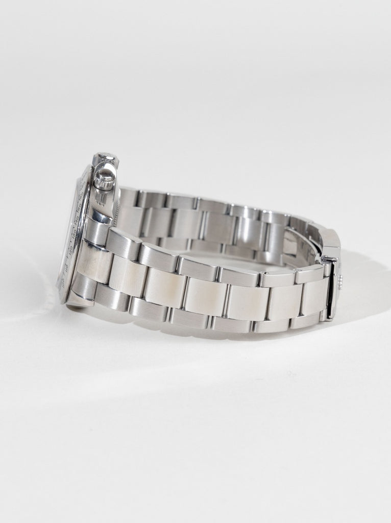 Den rene hvide skive med kontrasterende subdials og tachymeterskala på lynetten giver uret et skarpt og teknisk udtryk, mens det automatiske in-house kaliber sikrer præcision på højeste niveau. Oyster-lænken og den solide kasse fuldender et design, der både er robust og raffineret.