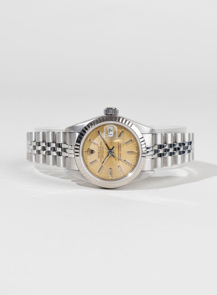 En elegant og klassisk Lady-Datejust, der forener tidløs Rolex-æstetik med raffineret proportion. Den smukke champagnefarvede skive giver uret et varmt og sofistikeret udtryk, mens den ikoniske riflet hvidguldslynettte tilfører et eksklusivt præg.