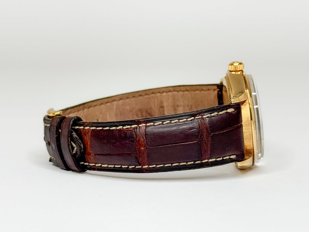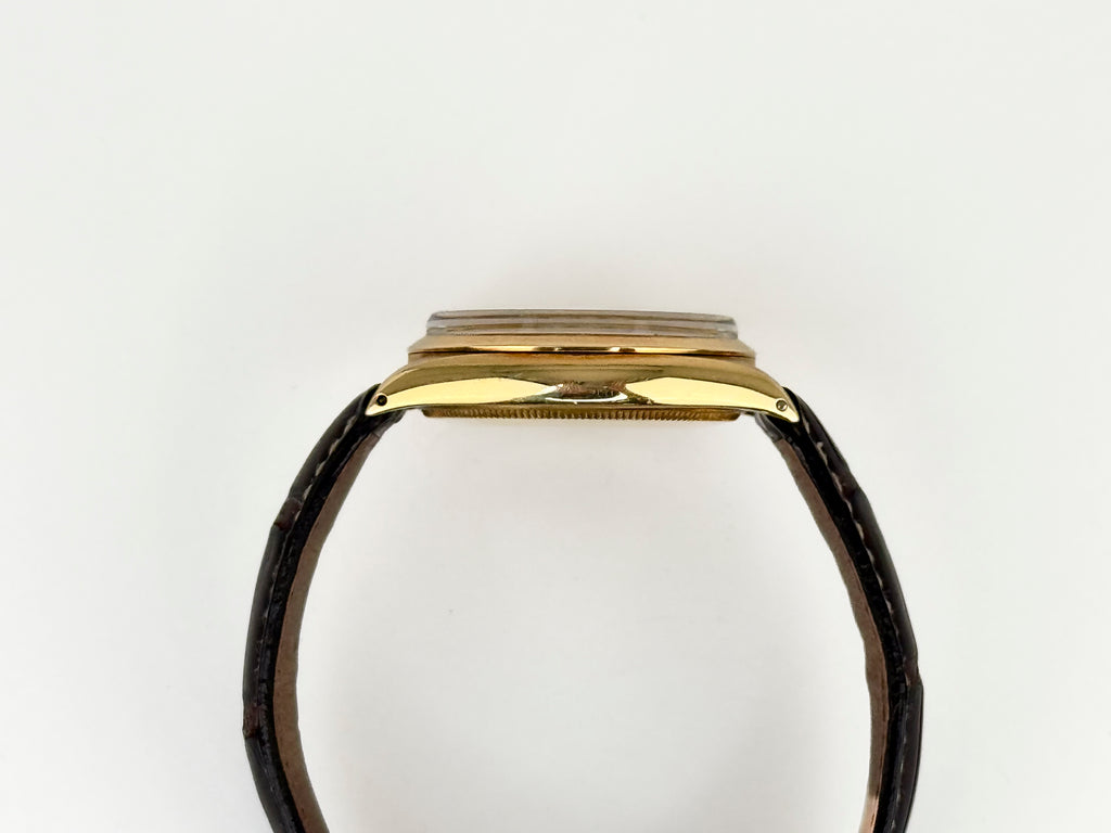 Underspillet vintage Rolex, når det er bedst. Et flot og yderst velholdt eksemplar af et Rolex Oyster Date fra 1972 i 14 karat guld med en charmerende, børstet gråbrun skive, plexiglas og det bundsolide kal. 1570 værk. Uret er monteret på en Klarlund alligatorrem med et originalt guldbelagt Rolex-spænde.