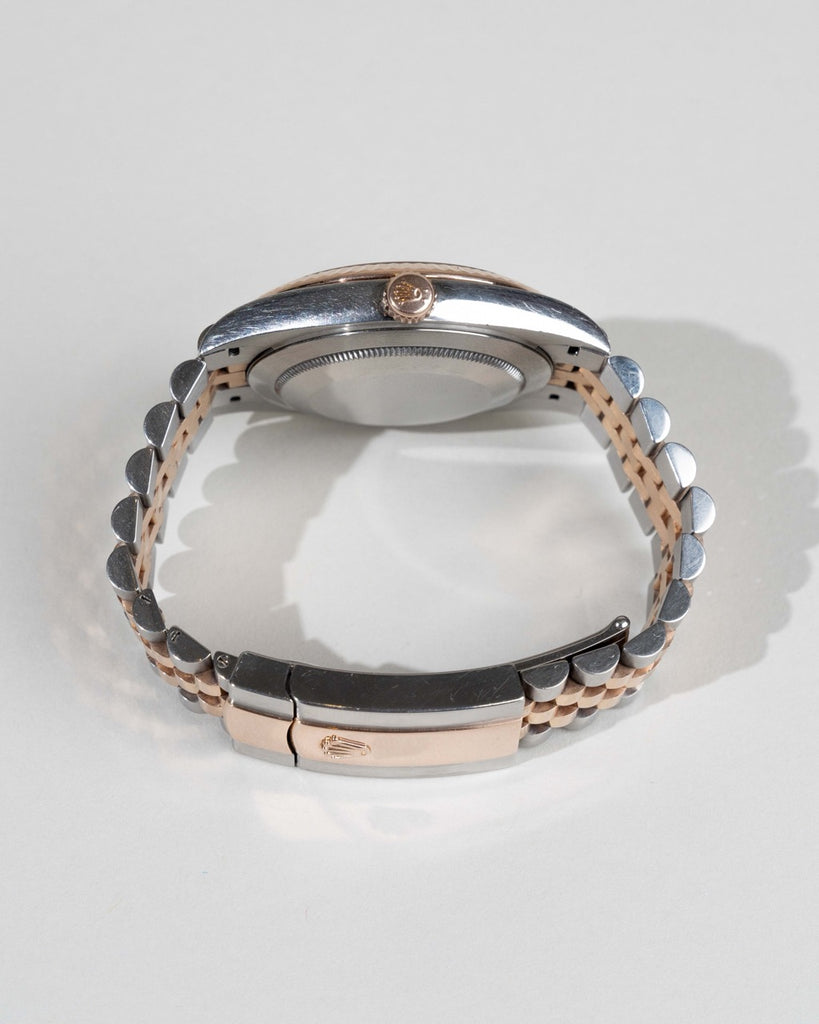 En luksuriøs version af den ikoniske Datejust, udført i Rolesor – en elegant kombination af stål og 18 kt Everose-guld. Den sølvfarvet skive prydes af funklende diamantindeks, der giver et raffineret og eksklusivt udtryk. Uret drives af det præcise automatiske Calibre 3235 og er udstyret med den klassiske Jubilee-lænke. Et perfekt valg for den, der ønsker et tidløst statement af elegance og prestige.