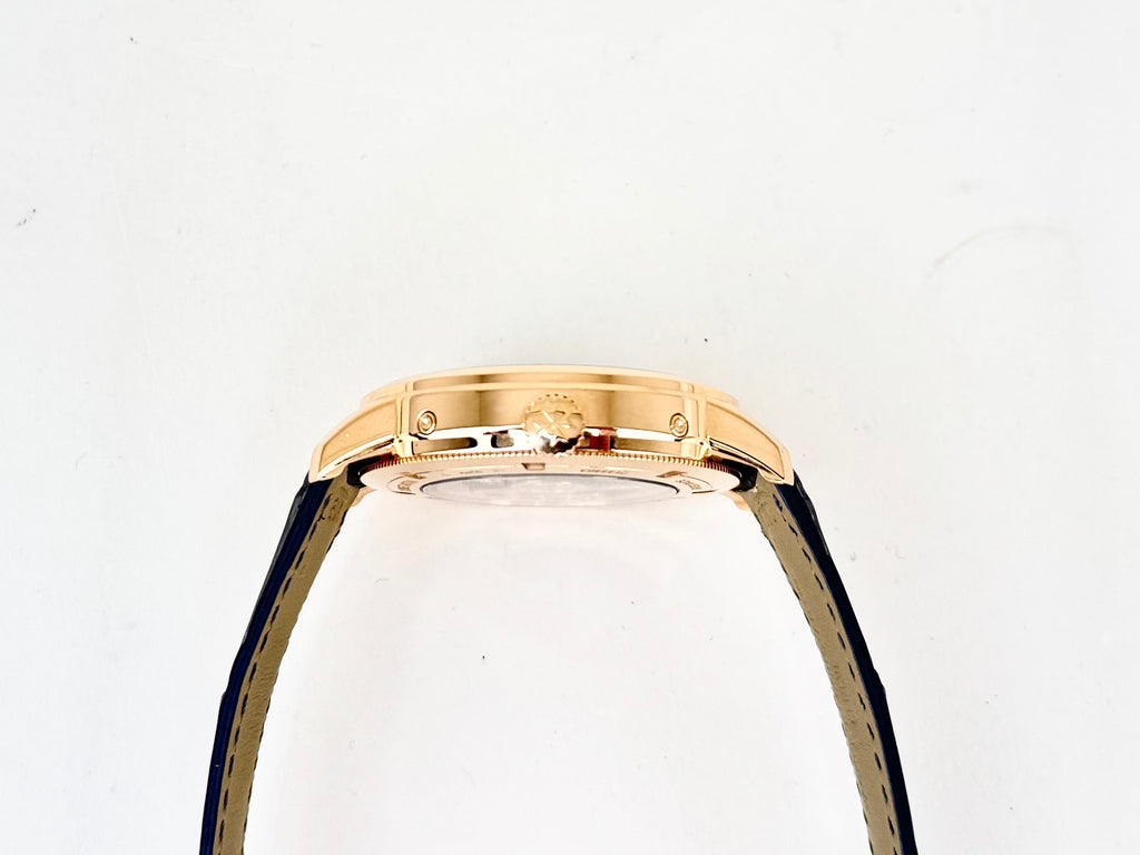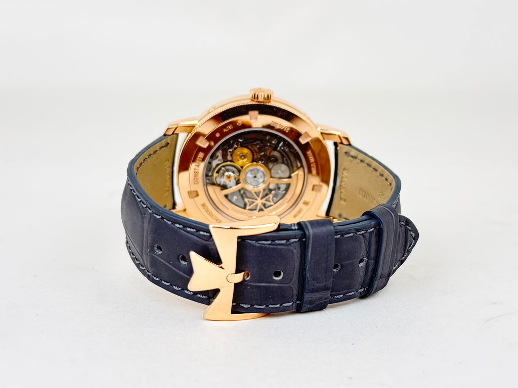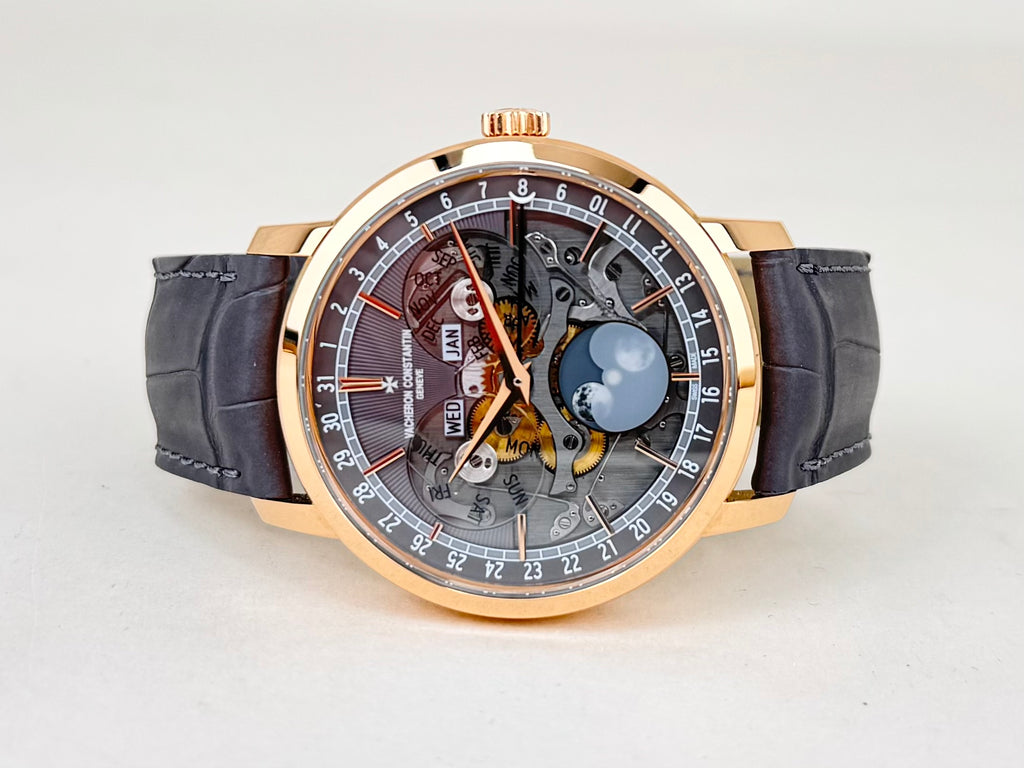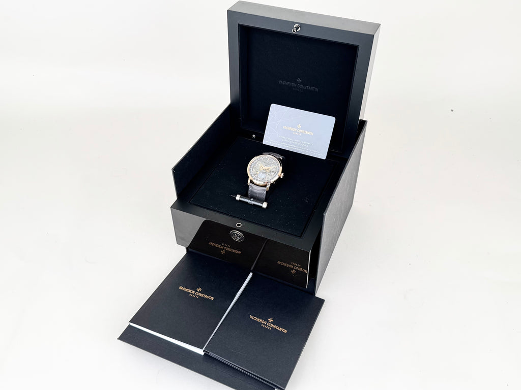 Dette er det fine Vacheron Constantin Traditionnelle komplet sæt i rosa guld. Uret er fra det meget anerkende Vacheron Constantin, uret er udstyret med komplet kalender komplikation, dag, dato, måned og månefase. Dette eksemplar kommer som et fuld sæt, men er ikke dateret. Hvilket vil sige at du kan scanne QR-koden på warranty kortet og starte en 8 år lang warranty hos Vacheron Constantin og teknisk set selv datere uret fra den dato du køber det.