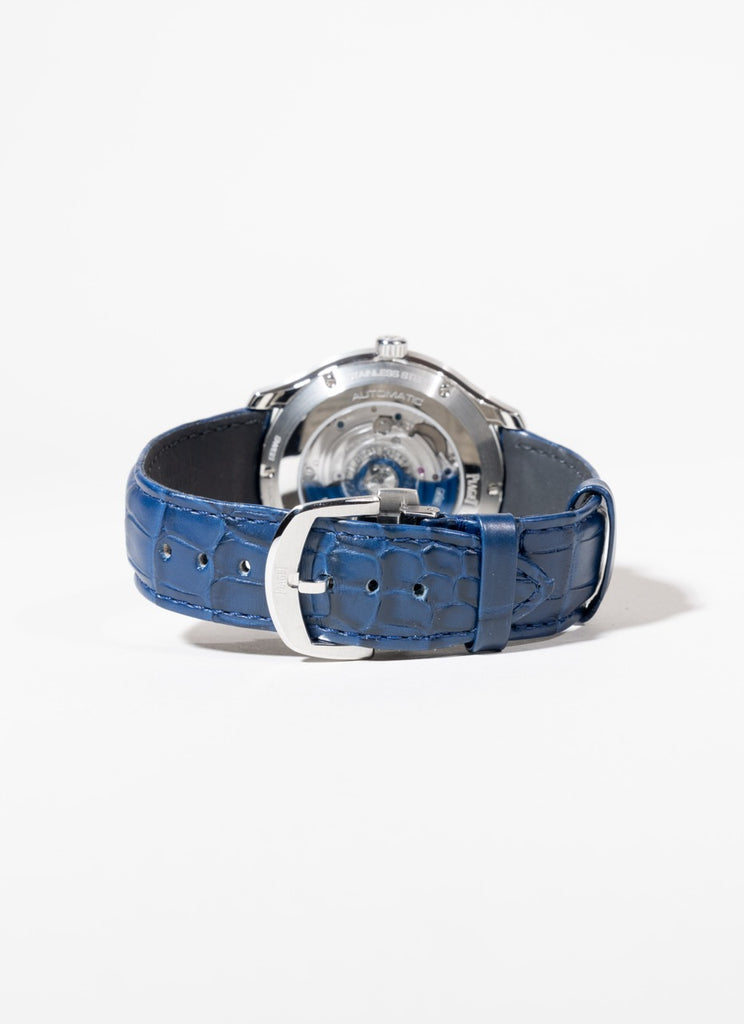 Elegant og moderne Piaget med smuk blå guilloché-skive, automatisk urværk og slank stålkasse. Uret kombinerer klassisk schweizisk håndværk med et sporty og eksklusivt udtryk, fuldendt af blå læderrem. Et raffineret valg til både hverdag og mere formelle lejligheder.