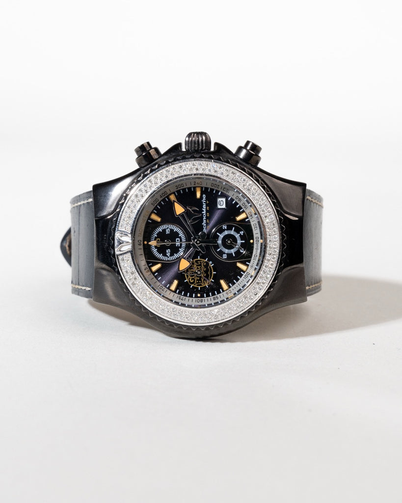 Et markant og sjældent ur fra TechnoMarine, skabt i samarbejde med det ikoniske Gumball 3000-rally. Modellen har en sort urkasse med en iøjnefaldende diamantbesat bezel og en sort skive med Gumball 3000-logoet. Kronograf-funktion, dato og sporty detaljer giver uret et kraftfuldt og eksklusivt udtryk. Et oplagt valg for samlere og entusiaster, der ønsker et unikt statement piece med attitude og kant.